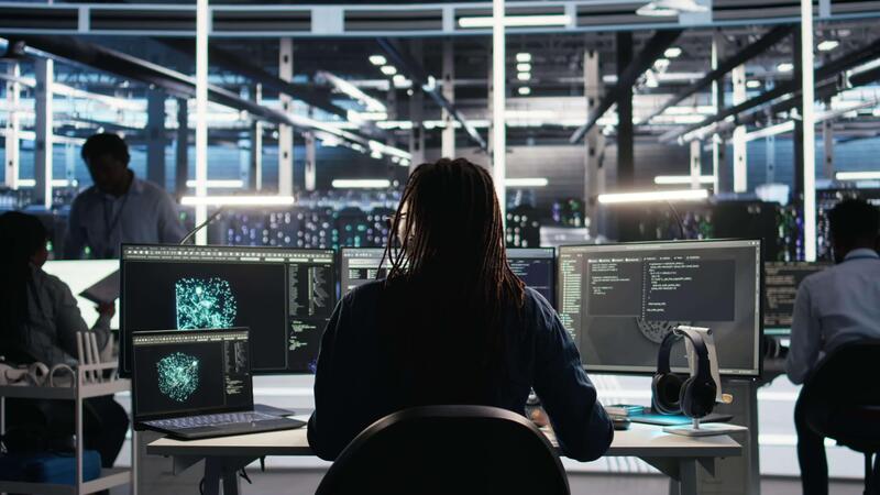 Irked data center IT expert smashing desk, upset by malfunctioning gear while using node tree software. Mad server hub engineer disgruntled by errors, using glitching AI visualization tech, camera A Pro Video