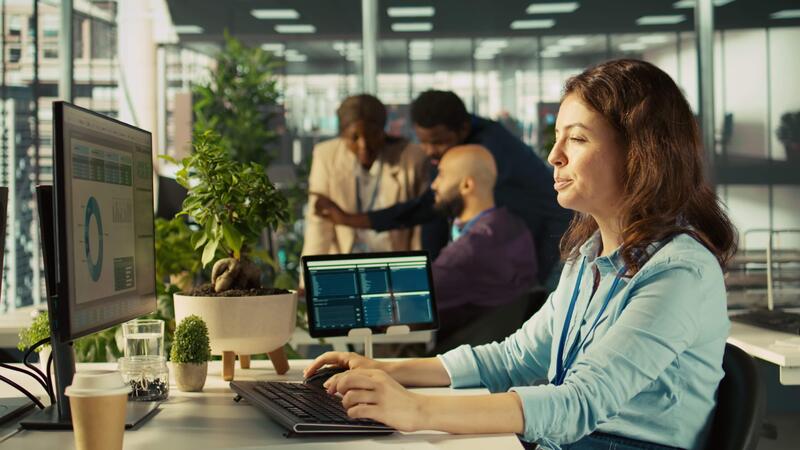 Employee at office desk typing on keyboard, editing documents on computer. Worker inputting data on spreadsheets in workplace at PC, working on statistical information, camera B Pro Video