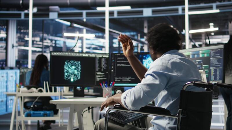Man in wheelchair dissatisfied with server farm AI analytics metrics. Data center admin with paraplegia frustrated by glitches while automating tasks using node tree programming tool, camera A Pro Video