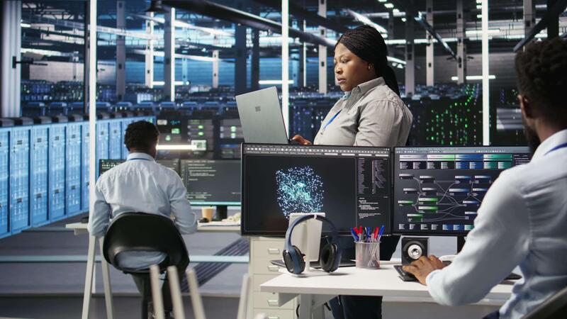 Portrait of joyous server hub technician using AI visualization insights to optimize system health. Joyful data center IT expert analyzing gear issues using node tree tools, camera A Pro Video
