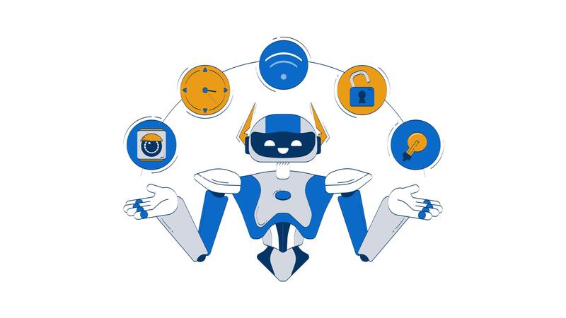 AI in smart home doodle animation. WiFi, fixtures, security, timer orchestration. AI assistant managing IoT automation animated 2D flat cartoon concept, white background. 4K motion graphic Pro Video