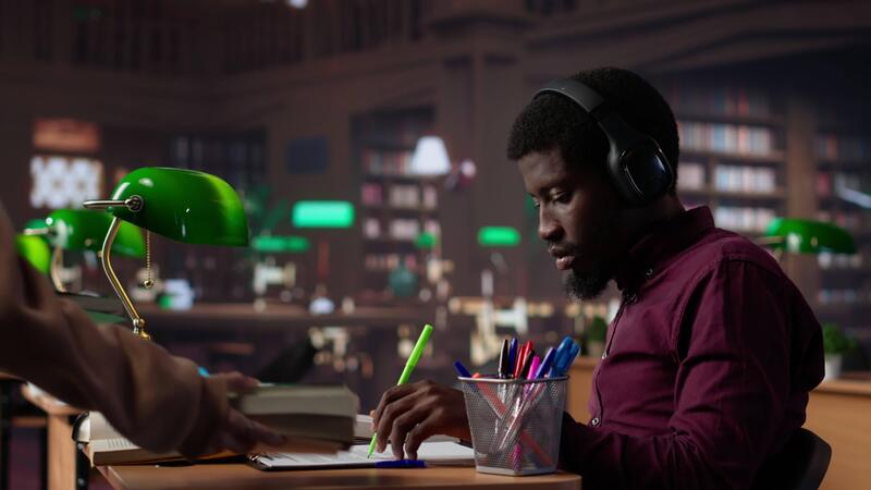 Black guy using study music to help with deep focus for academic success, consulting the campus university database to find reliable sources. Male college student fights for diploma. Camera A. Pro Video