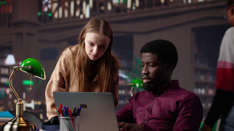 Multiethnic pupils working on team project assignment at campus library, consulting academic database and research collection with various books. Young adults guarantee high grades. Camera A. Pro Video