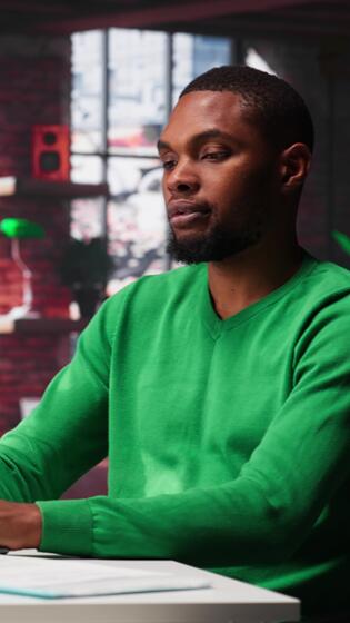 Vertical Man at home desk using laptop and checking emails displayed on screen, reading messages in inbox and sending replies. Young adult managing electronic correspondence, organizing folders. Camera A. Pro Video
