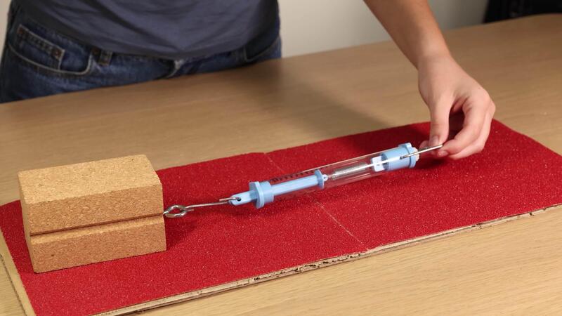 A hand pulls a wooden block across sandpaper using a spring scale, demonstrating friction and force measurement Pro Video