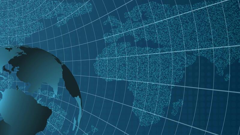 Animated globe rotates against a digital world map backdrop, highlighting continents with a cool blue color scheme Pro Video