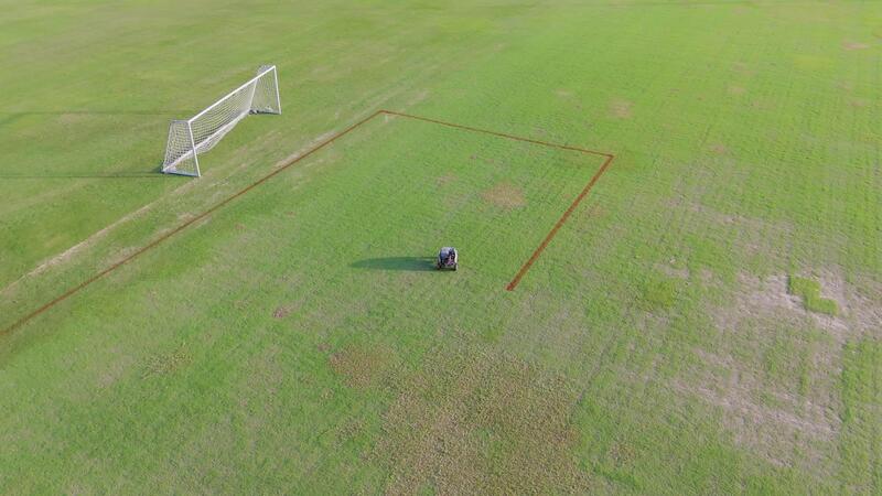 Aerial view of a robot autonomously painting precise lines on a soccer field under clear daylight Pro Video