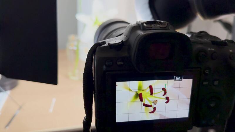 A photographer adjusts camera settings for macro shots of a flower in a studio environment with controlled lighting Pro Video