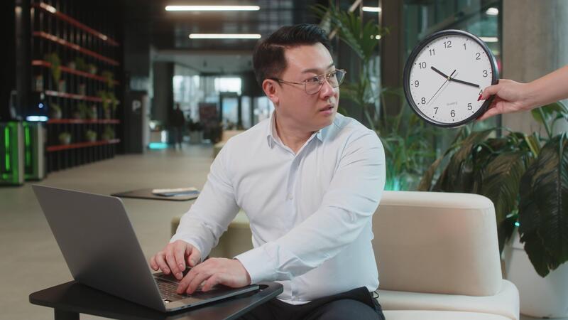 Chinese businessman working on laptop with anxiety checking time on clock, running late to work being in delay deadline. Manager man in shirt looking at hour, minutes worrying to be punctual in lobby. Pro Video