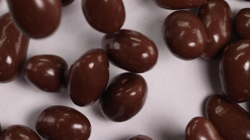 Chocolate-covered peanuts cascade onto a white surface, creating a dynamic and appetizing visual with smooth, glossy textures Pro Video