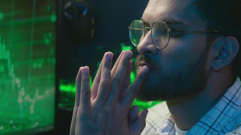 Thoughtful programmer Arabian Indian man thinking worried difficult task problem male ethnic guy at night office unsure broker trader looking at computer chart crypto currency coder doubtful hacker Free Video