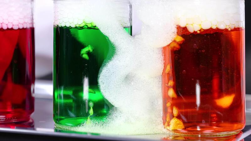 Vibrant liquids react with dry ice, creating colorful bubbling effects in a science experiment setting Pro Video