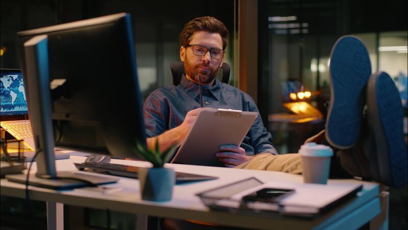 Caucasian business man trader businessman analyst writing document in night office paperwork overtime evening working online trading thinking write notes thoughtful guy male developer think ideas task Pro Video