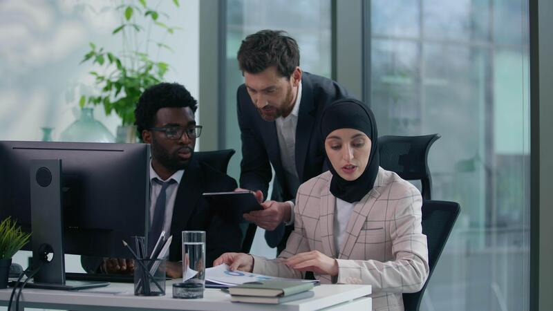 Multiracial diversity multiethnic business team colleagues arguing about online computer working paper document discuss in office misunderstanding talking solving problem talk job difficulty trouble Pro Video