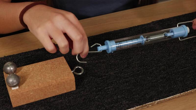 Hands using a spring scale to measure force on a block, illustrating friction on a carpeted surface Pro Video