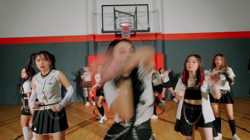 A dynamic dance performance in a gymnasium featuring multiple dancers in coordinated outfits. The scene captures energy and movement, with a basketball hoop in the background. Pro Video