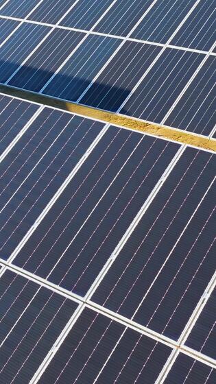 Sunlit solar panels arranged in rows on a farm, captured from an aerial perspective with dynamic shadows Pro Video