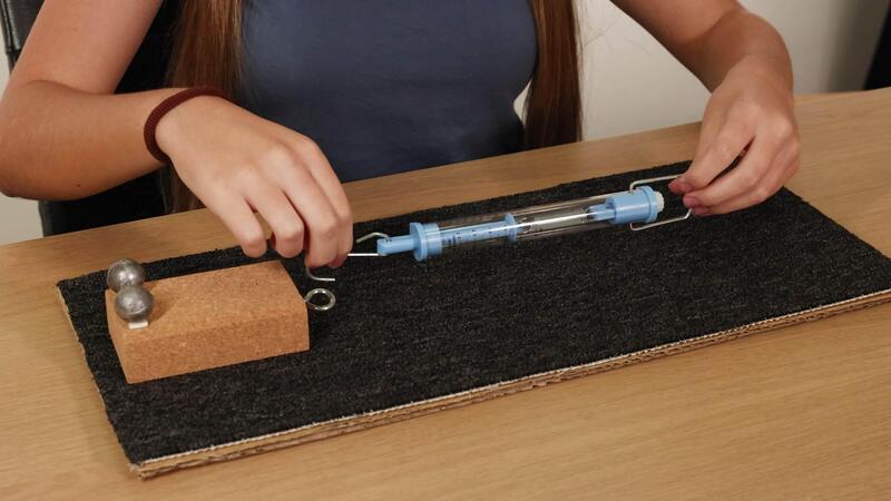 A person conducts a friction experiment using a spring scale, weights, and a textured surface on a table Pro Video