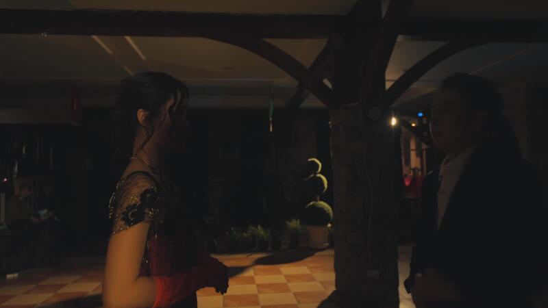 A couple dancing at a festive event, with one person in a colorful dress and the other in a suit. The setting is illuminated with soft lights, creating a romantic atmosphere. Pro Video