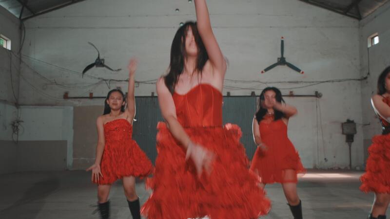 Three dancers in red dresses performing energetically in an industrial space. The focus is on the central dancer, who is expressing intense emotion. The background features a simple, rustic setting Pro Video