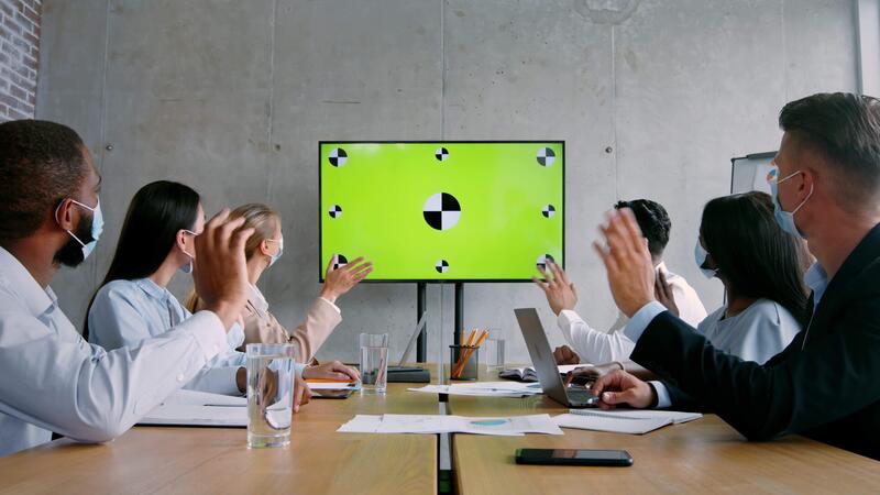 A diverse group of professionals in face masks is engaged in a collaborative session at a stylish office. They are attentively interacting with a large screen displaying visual content. Pro Video