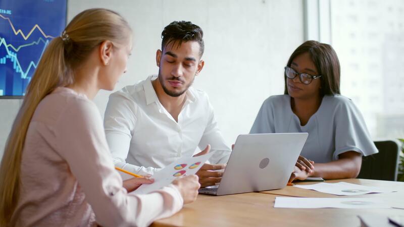 Three professionals engaged in a discussion at an office table, analyzing charts and strategy documents. The atmosphere conveys teamwork and collaboration during a successful planning session. Pro Video