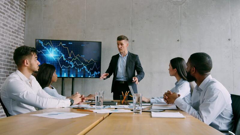 A group of professionals is engaged in a business meeting. The leader presents data on a screen while the team attentively listens. They are in a modern office setting. Pro Video