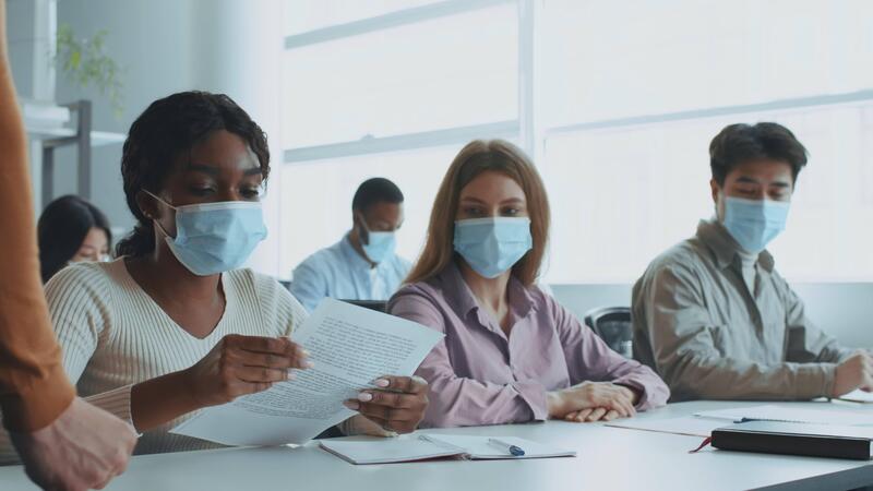 In a bright classroom, diverse college students wear masks while collaborating on a project. They exchange notes and ideas, emphasizing teamwork and education in a university setting. Pro Video