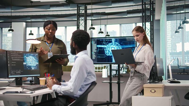 Junior developer utilizing artificial intelligence to optimize performance and forecast issues. Young female engineer in office training machine learning models, camera A Pro Video