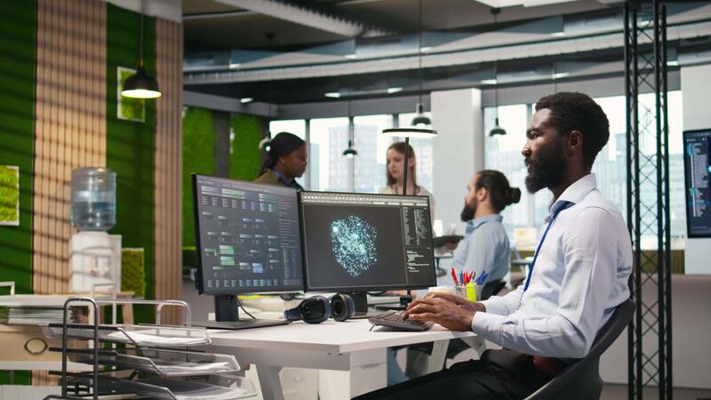 Programmer optimizing performance using AI LLM chatbot recommendations. African american worker uses artificial intelligence assistant to convert manual workflows into automated scripts, camera A Pro Video
