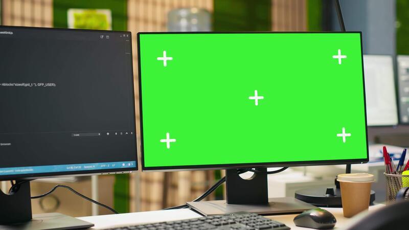 Technology company workspace with chroma key computer used to conduct code reviews, fixing bugs. Isolated screen PC on office desk used to design and implement algorithms Pro Video