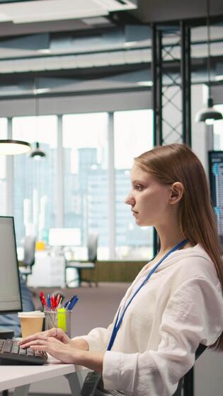 Vertical Female engineer using AI LLM chatbot, optimizing company systems performance. System administrator uses artificial intelligence assistant to convert manual workflows into automated scripts, camera A Pro Video