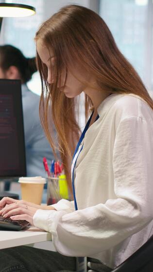 Vertical Young programmer in office requests help from IT experts detecting and blocking hacker intrusion. Intern assisted by staff members coordinating incident response for network attack, camera A Pro Video