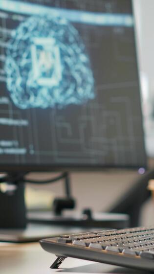 Vertical Empty startup office with artificial intelligence neural networks program running on PC displays used by programmers. AI company workspace computers leveraging deep learning technology Pro Video