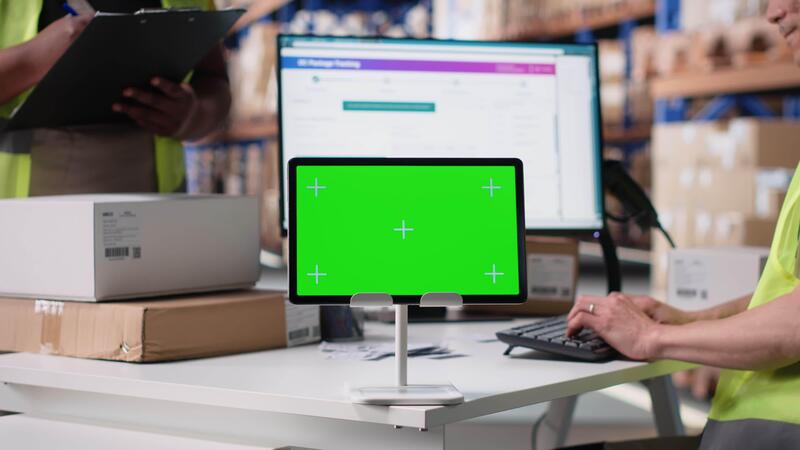 Asian employee uses a isolated mockup screen on computer, business software used for supply chain system and package tracking service. Real-time order fulfillment displays. Camera B. Pro Video
