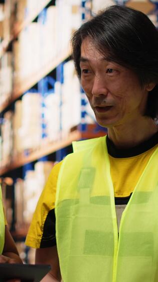 Vertical African american and asian team prepare shipments for dispatch with digital inventory and cargo pallets on depot racks. Working in a large scale distribution hub for express delivery. Camera B. Pro Video