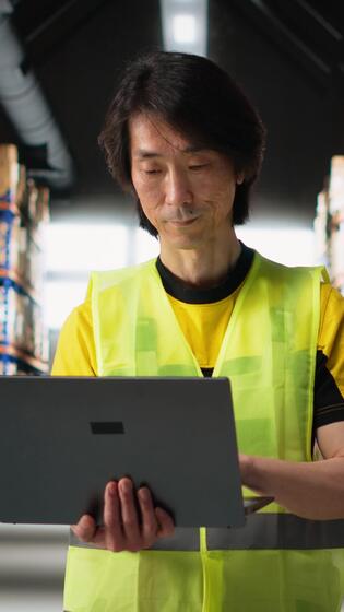 Vertical Asian male employee oversees product handling and order fulfillment, ensures inventory control using technology and packages coordination for efficient local delivery service. Camera B. Pro Video