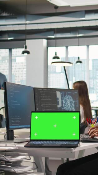 Vertical Technician next to office coworkers developing software applications using green screen laptop, integrating AI automation. IT expert debugging applications with mockup notebook, camera A Pro Video