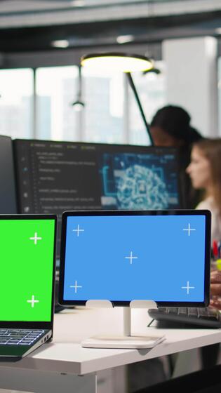 Vertical Software developer using AI on isolated screen laptop and tablet to optimize performance and forecast issues. IT expert in office training machine learning models using chroma key notebook, camera A Pro Video
