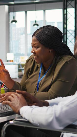 Vertical Cheerful manager and employee with paraplegia in inclusive workplace developing software applications. African american technician and colleague with disability using AI to solve bottlenecks, camera A Pro Video