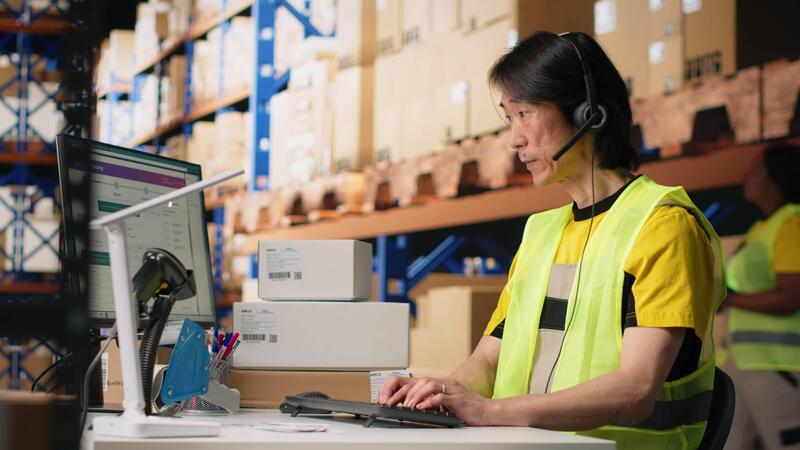 Call center employee assisting customers in a fulfillment center, handling inventory control and package tracking. Asian man resolving issues related to delivery delays or wrong addresses. Camera B. Pro Video