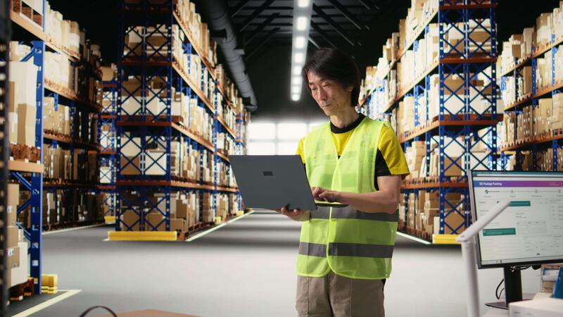 Warehouse employee in hi vis vest preparing packages for local delivery, processing custom orders and handling merchandise within large business operation focused on e-commerce. Camera A. Pro Video