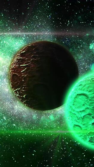 A voluminous planet with a rocky structure rotates in space. A satellite revolves around it. Free Video