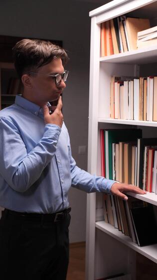vertical A man in a library doesn't know which book to choose. The confused man shrugs his shoulders, doesn't know what to do. The man couldn't find the right book on the bookshelf. Pro Video