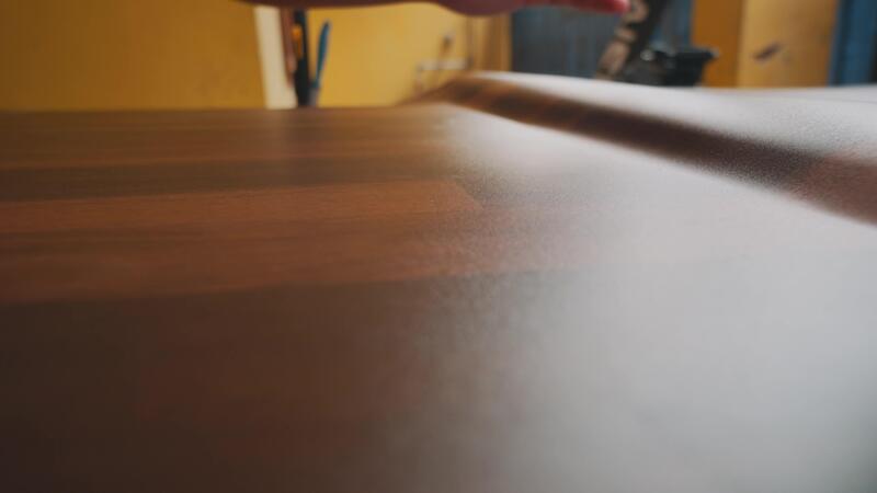 A close-up view of a hand smoothing a wooden surface, showcasing the texture and grain of the wood. The background is blurred, emphasizing the craftsmanship involved in woodworking. Pro Video