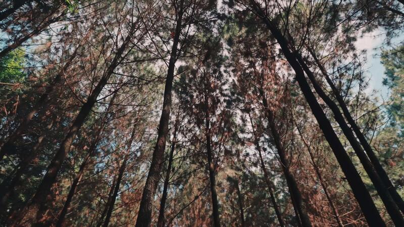 A low-angle shot looking directly up at the canopy of a dense pine forest. The tall, straight trunks create a powerful and immersive natural pattern against the bright sky, perfect for background use. Pro Video