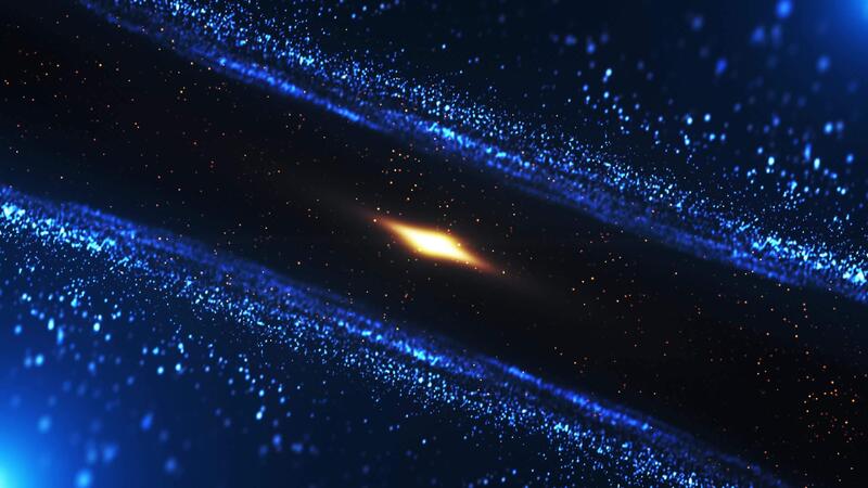 Abstract blue particles and glowing lines with a bright golden light in dark space. Futuristic cosmic motion background perfect for technology, sci-fi, space, and digital projects. Seamless loop Pro Video
