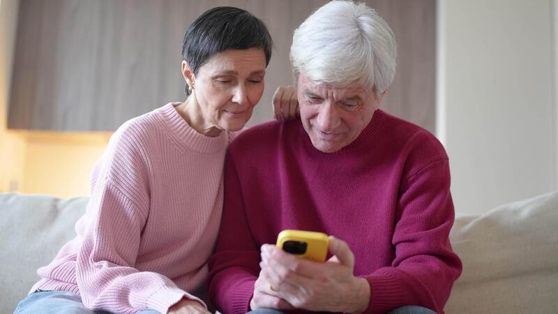 Smiling passionate father learns smartphone use from happy daughter. Gadget introduction internet Pro Video