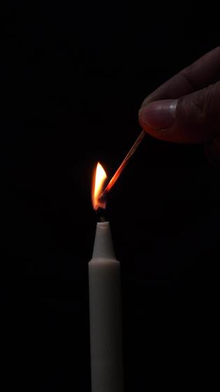 A person is seen igniting a white candle using a matchstick in a darkened environment, capturing a moment of illumination and atmosphere creation. Pro Video