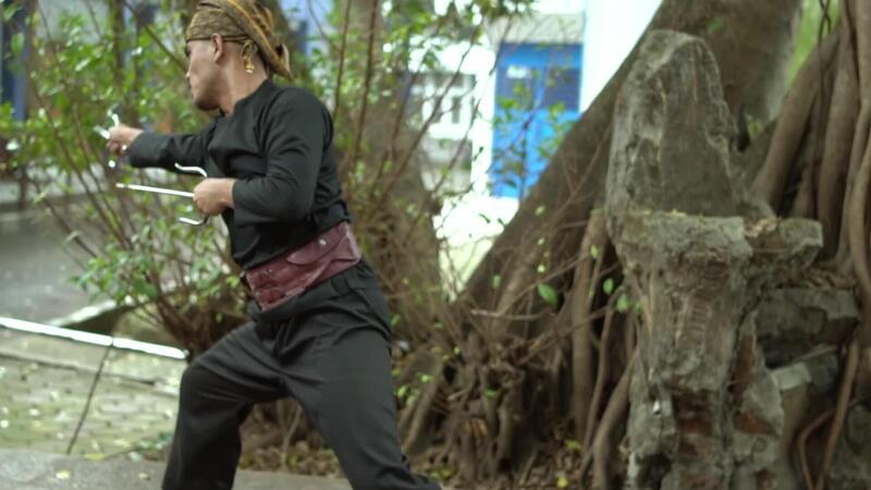 A martial artist performing a dynamic move in a natural setting with large trees and roots in the background. The individual is dressed in black attire and a red belt, showcasing agility and focus. Pro Video